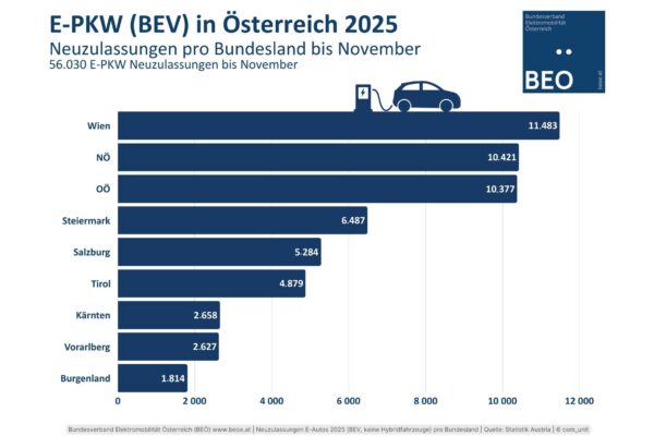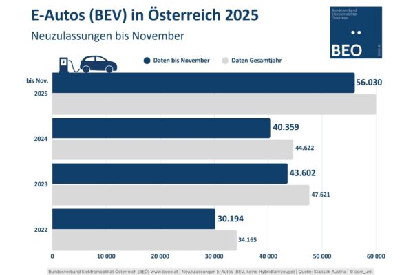 Bis Ende November 2025 wurden in Österreich 56.030 E-Autos zugelassen.