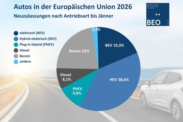 Mit Jänner 2026 gibt es in NÖ und OÖ die meisten elektrisch betriebenen Pkw.