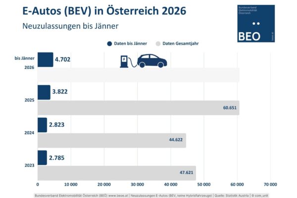 Bis Ende Dezember 2025 wurden in Österreich 60.651 E-Autos zugelassen.