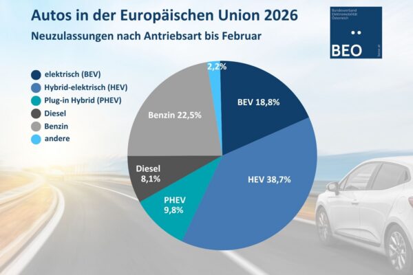 Mit Ende Februar 2026 gibt es in Österreich 265.914 rein elektrisch betriebene Pkw.