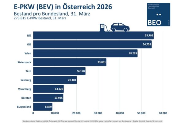 Mit März 2026 gibt es in NÖ und OÖ die meisten elektrisch betriebenen Pkw.