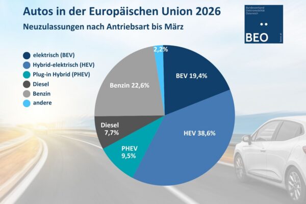 Bis Ende März 2026 wurden in Österreich 17.347 E-Autos zugelassen.