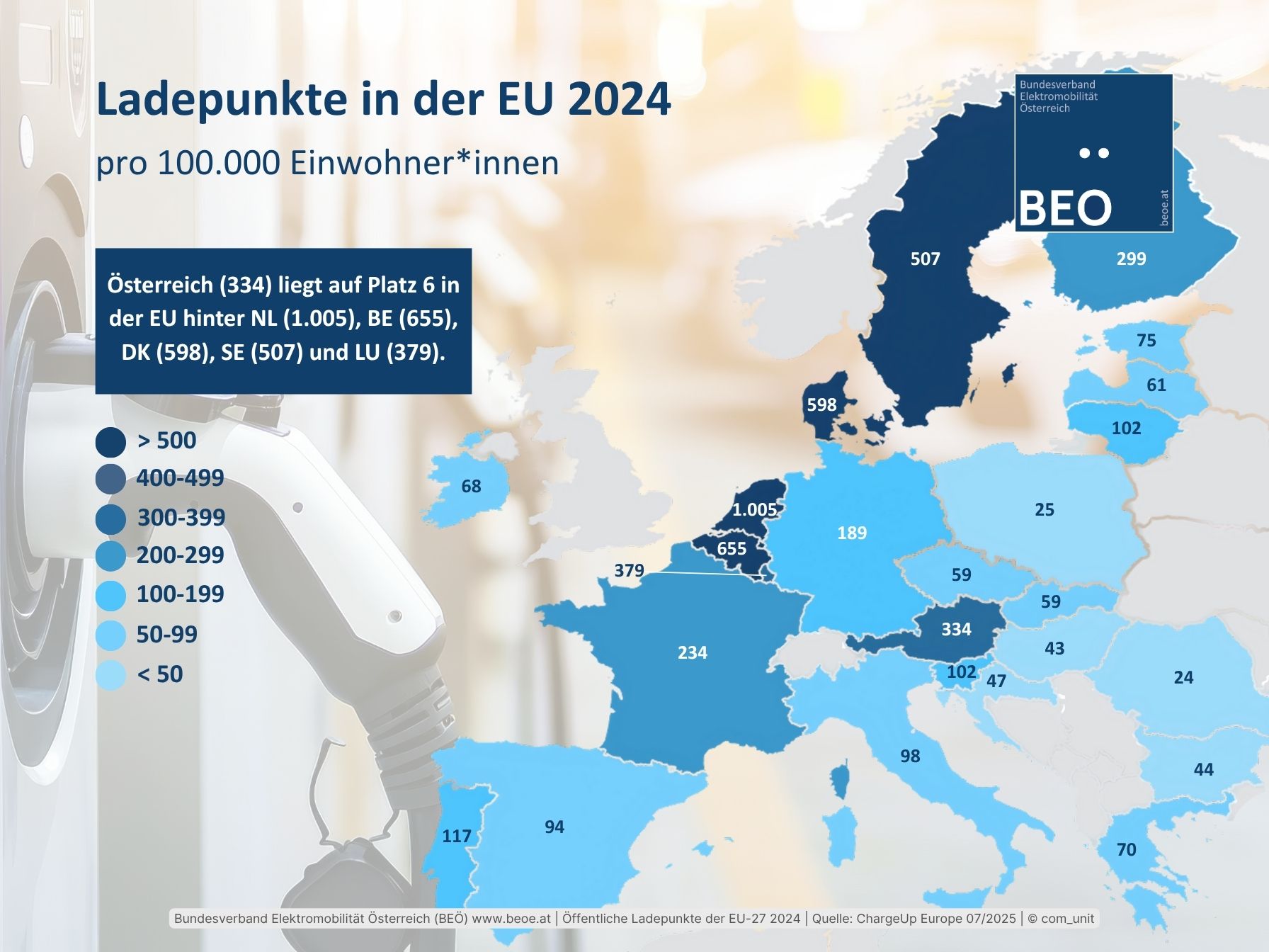 Im Jahr 2024 gab es in der Europäischen Union durchschnittlich 199 Ladepunkte pro 100.000 Einwohner*innen. An erster Stelle liegen die Niederlande mit 1.005 vor Belgien (655), Dänemark (598), Schweden (507) und Luxemburg (379). Österreich liegt mit 334 Ladepunkten pro 100.000 Einwohner:innen auf Platz sechs.