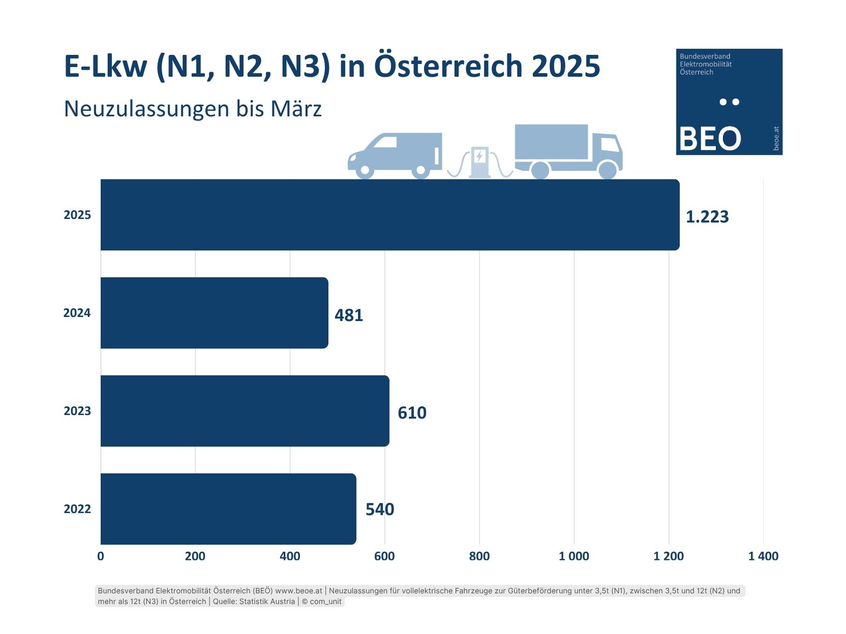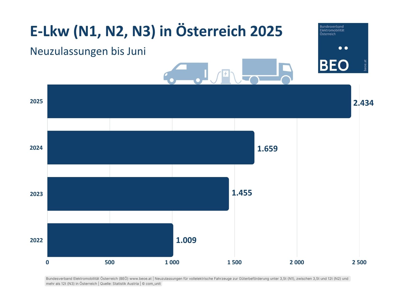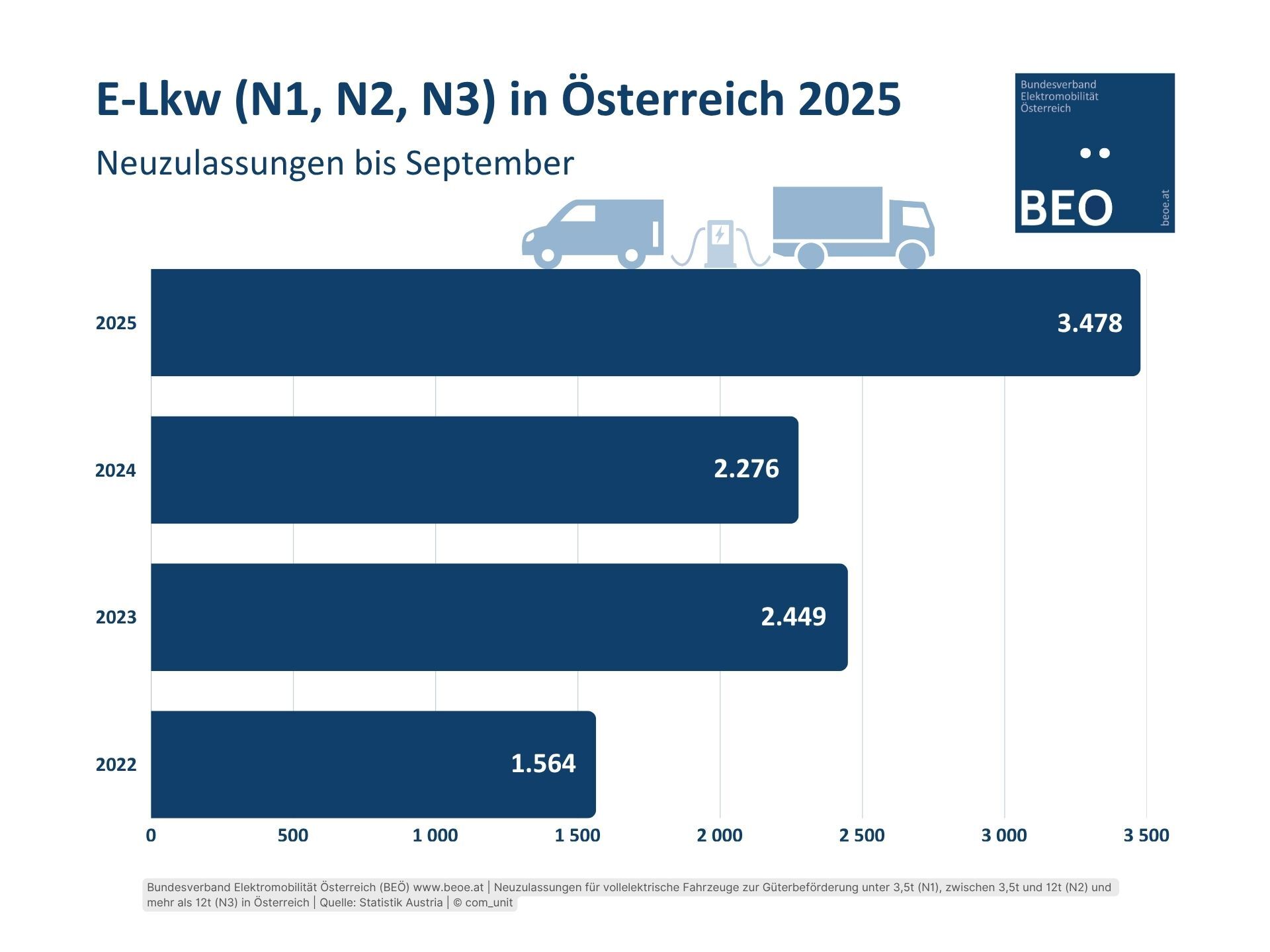 Bis Ende September 2025 wurden in Österreich 3.478 E-Fahrzeuge der Klassen N1 (3.323), N2 (86), und N3 (69) neu zugelassen. Das sind 13 Prozent der Neuzulassungen aller Fahrzeuge der Klassen N1, N2, N3. Daten: Statistik Austria