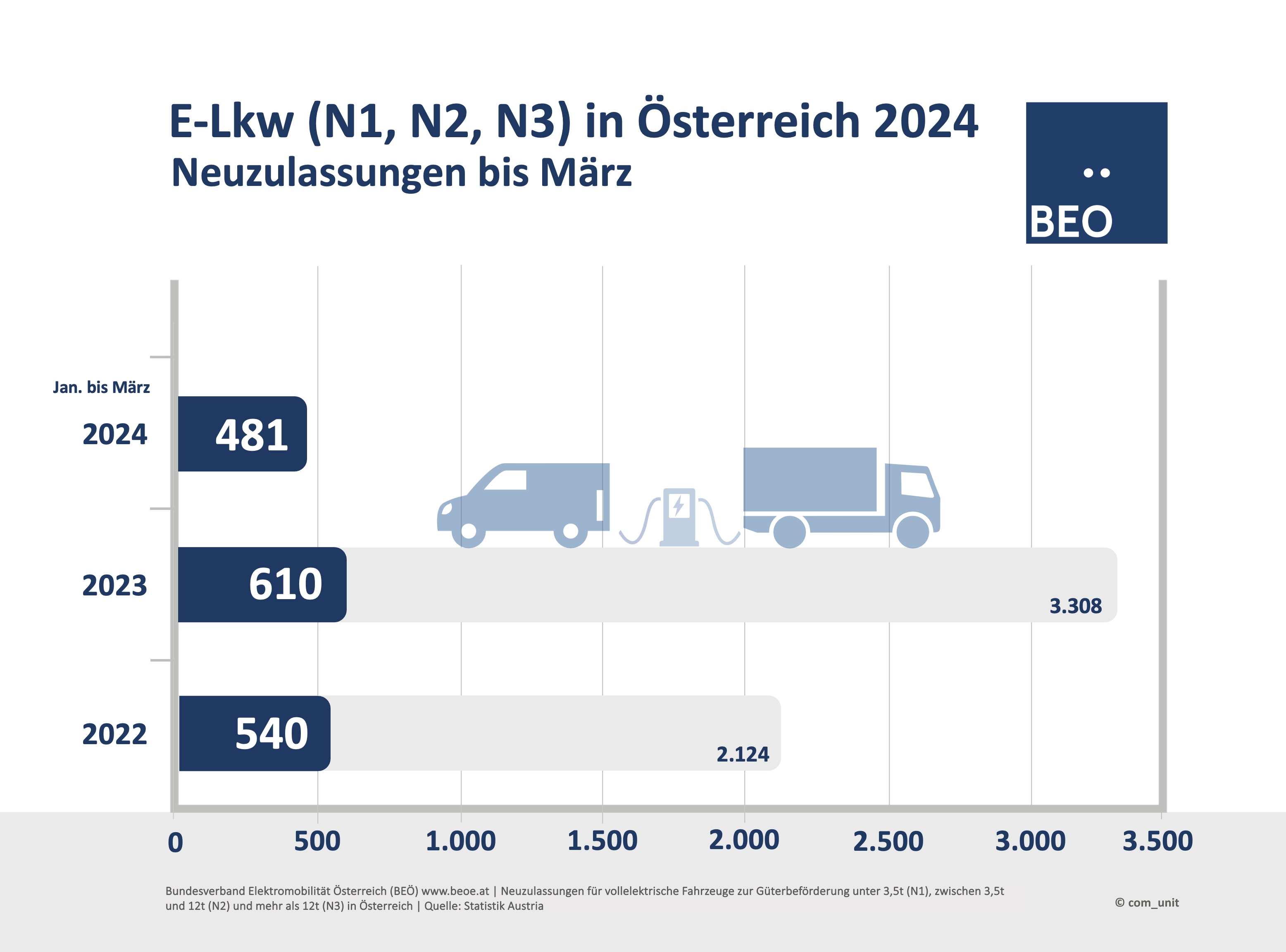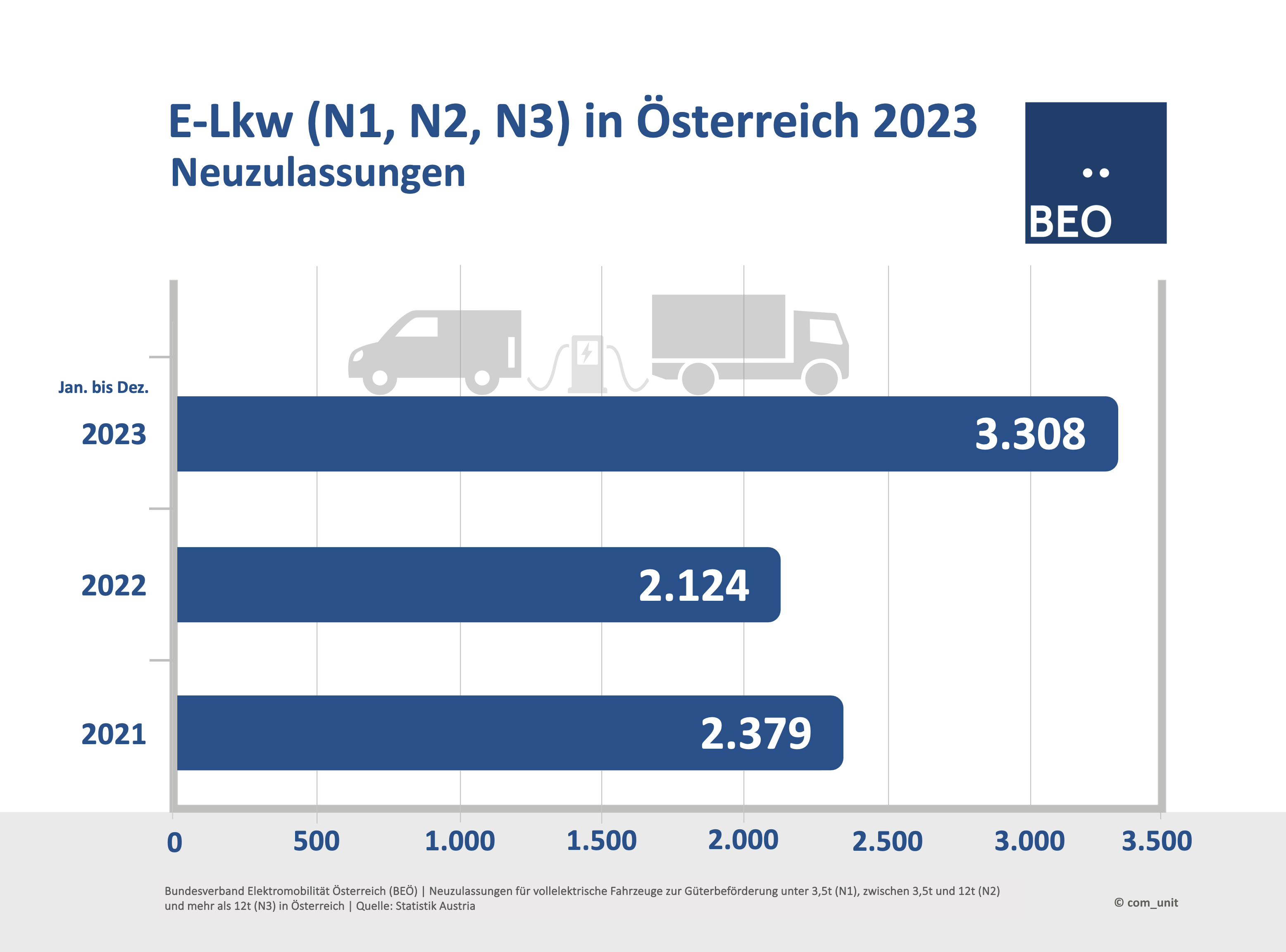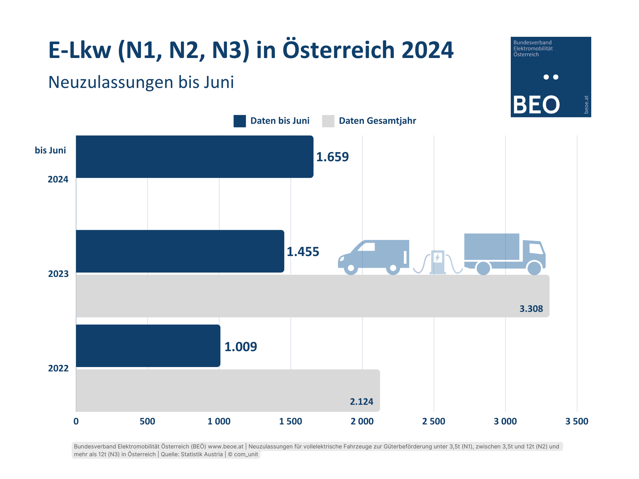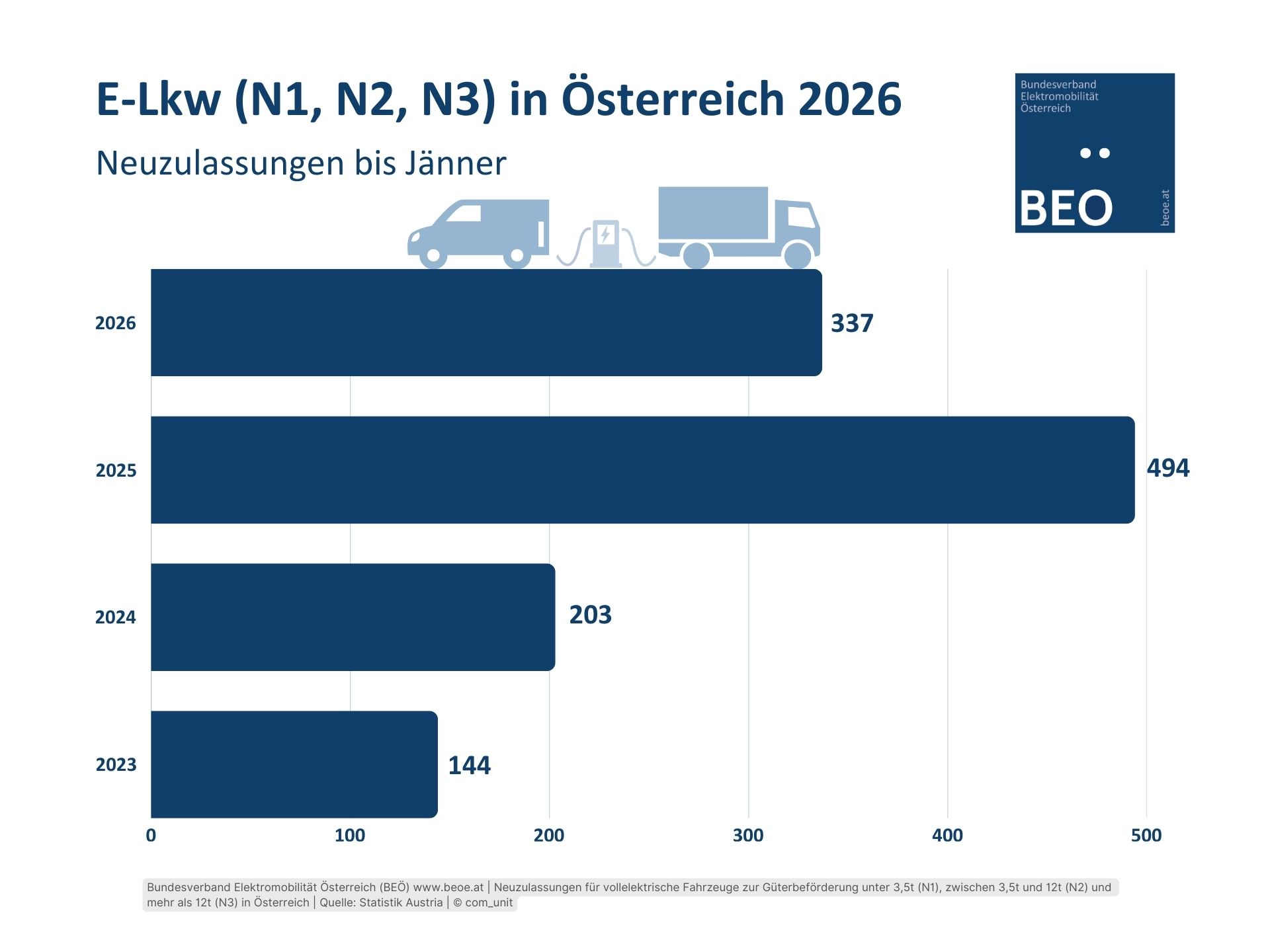 Bis Ende September 2025 wurden in Österreich 3.478 E-Fahrzeuge der Klassen N1 (3.323), N2 (86), und N3 (69) neu zugelassen. Das sind 13 Prozent der Neuzulassungen aller Fahrzeuge der Klassen N1, N2, N3. Daten: Statistik Austria