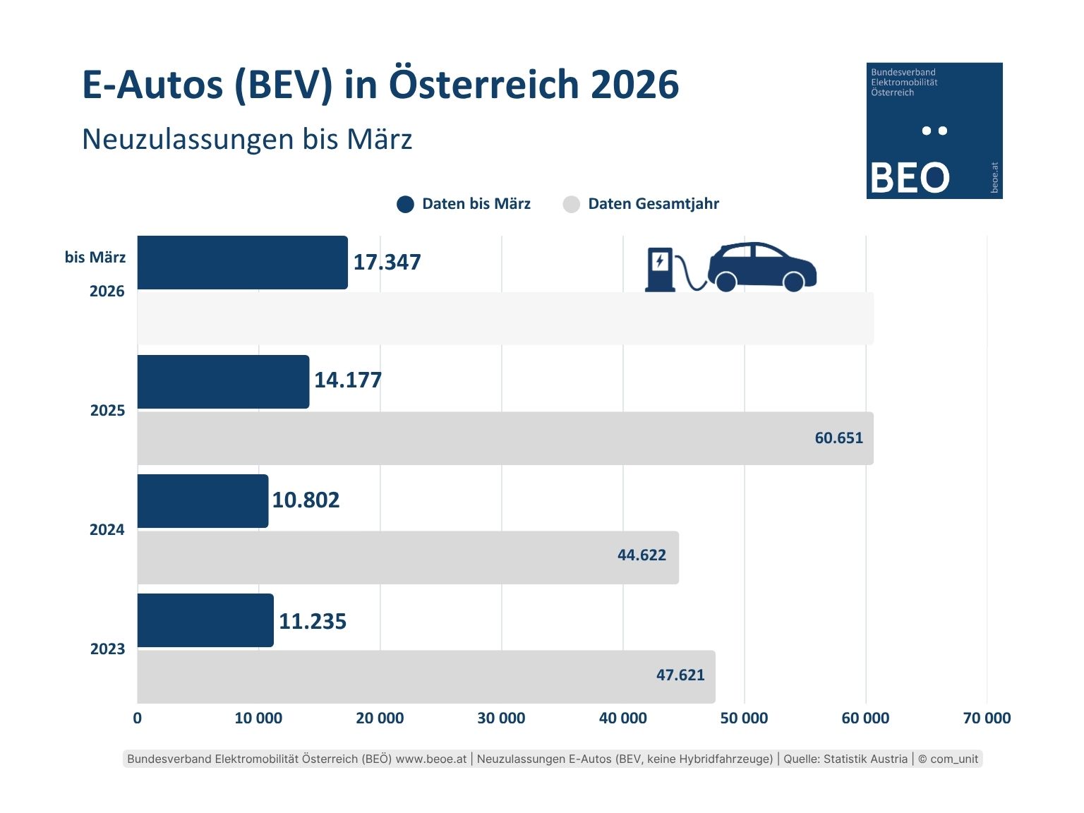 Bis Ende März 2026 wurden in Österreich 17.347 E-Pkw neu zugelassen. Das sind 22,5 Prozent aller Neuzulassungen; gegenüber dem Vorjahr ein Plus von 22,4%. Benzin-Elektro-Hybride verzeichnen ein Plus von 42%. Bei Benziner gibt es ein Plus von 4,3%, bei Diesel-Pkw einen Rückgang von 9,5%. Daten: Statistik Austria