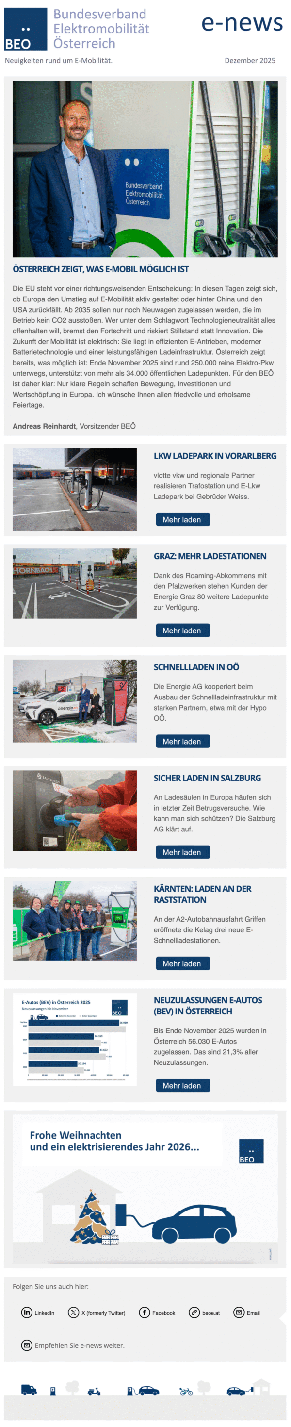 Melden Sie sich hier für BEÖ e-news an. Der kostenfreie Newsletter informiert Sie regelmäßig über aktuelle Entwicklungen und Trends aus der Welt der Elektromobilität. Sie können e-news jederzeit einfach abbestellen.