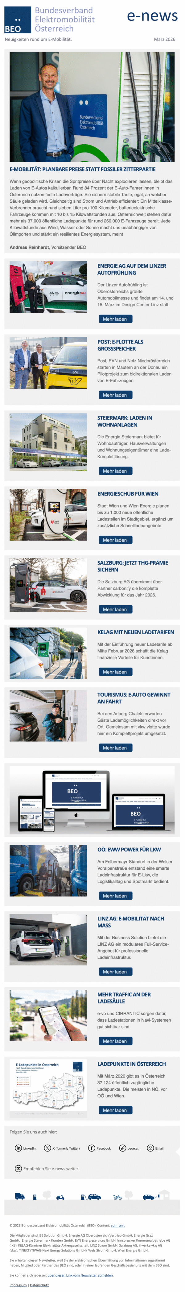 Melden Sie sich hier für BEÖ e-news an. Der kostenfreie Newsletter informiert Sie regelmäßig über aktuelle Entwicklungen und Trends aus der Welt der Elektromobilität. Sie können e-news jederzeit einfach abbestellen.