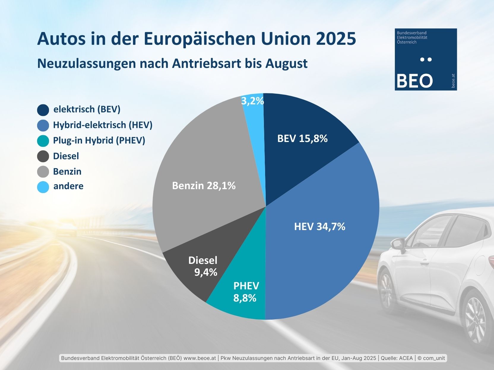 Von Jänner bis Mai 2025 wurden in der EU 701.089 neue batterieelektrische Fahrzeuge (BEV) zugelassen – ein Marktanteil von 15,4 Prozent. Im Vergleich zum Vorjahreszeitraum ist das ein Anstieg von über 3%. Hybrid-Elektrofahrzeugen (HEV) legen mit 1,6 Millionen Neuzulassungen deutlich zu und erreichen einen Marktanteil von 35,1%. Auch Plug-In-Hybride sind weiter gefragt und machen nun 8,2 Prozent des Marktes aus. Der Marktanteil von Benzinfahrzeugen fiel auf 28,6 Prozent, Dieselfahrzeuge verloren ebenfalls weiter an Boden: Ihr Marktanteil liegt nur noch bei 9,5 Prozent.