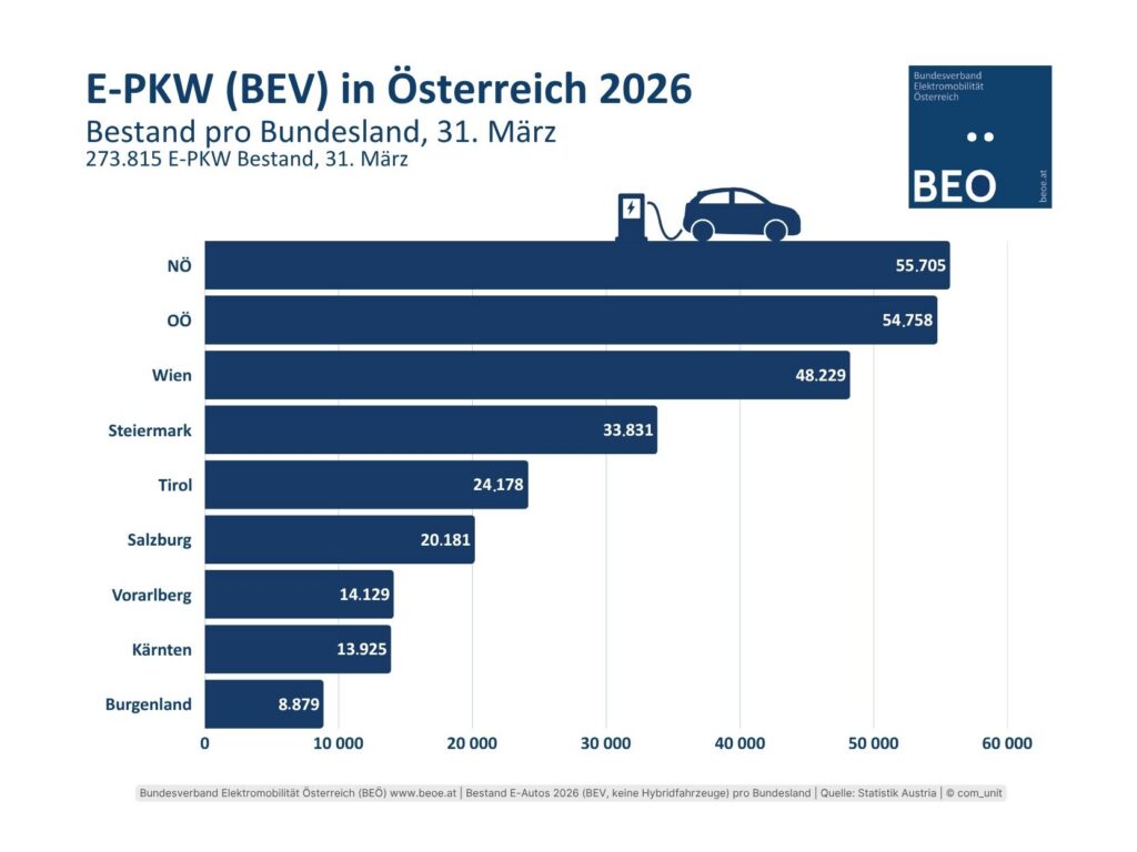 Mit März 2026 gibt es in NÖ und OÖ die meisten elektrisch betriebenen Pkw.