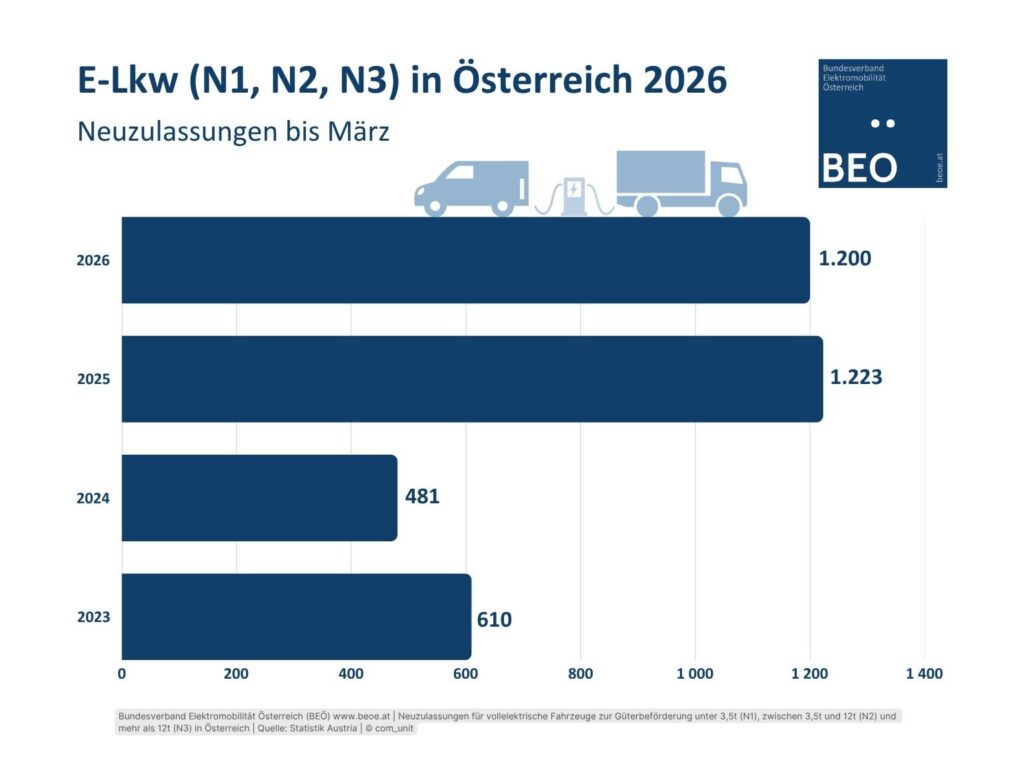 Bis Ende März 2026 wurden 1.200 E-Fahrzeuge der Klassen N1, N2 und N3 neu zugelassen.