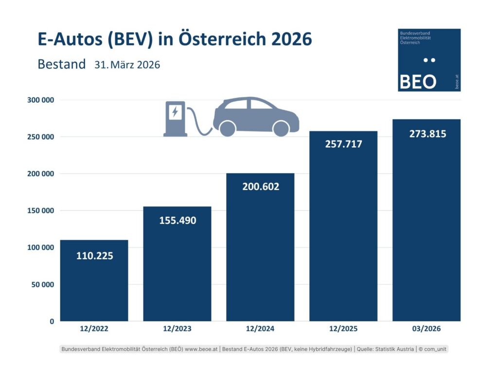 Mit Ende März 2026 gibt es in Österreich 273.815 rein elektrisch betriebene Pkw.