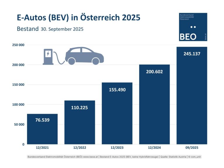 Mit Ende September 2025 gibt es in Österreich 245.137 rein elektrisch betriebene Pkw.
